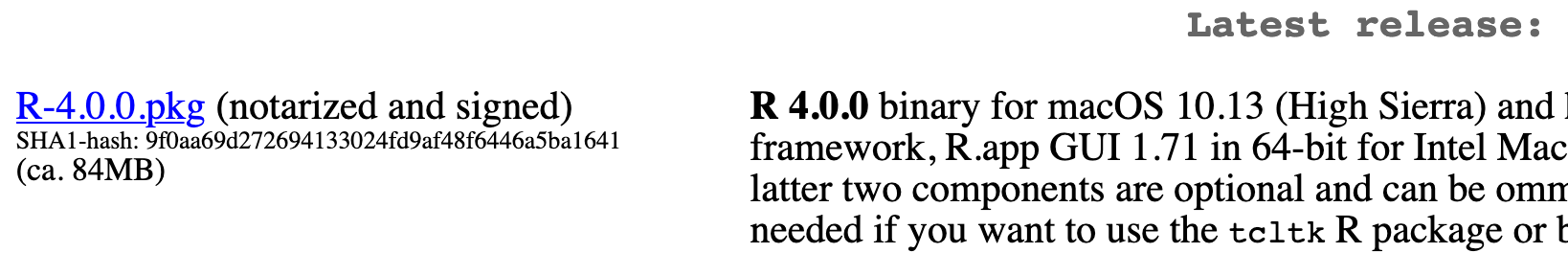 .pkgfile in the list of files (in this picture, it’sR-4.0.0.pkg; as of right now, the current version is 4.2.1) and download it.