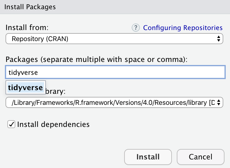 Notice also that RStudio will generate a line of code for you and run it: install.packages("tidyverse"). You can also just paste and run this instead of using the packages panel.